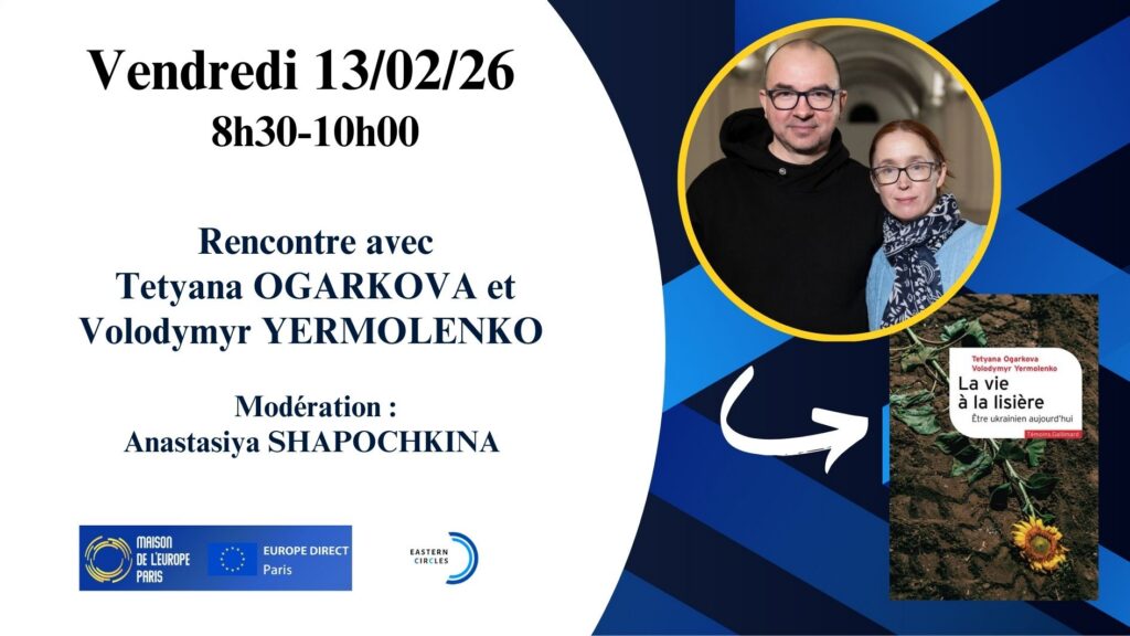 Michel DERDEVET, président de la Maison de l’Europe de Paris, reçoit Tetyana OGARKOVA, Maître de conférences à l’université Mohyla de Kyiv, responsable du département international à l’ONG Ukraine Crisis Media Center, et Volodymyr YERMOLENKO, philosophe et écrivain, lauréat de plusieurs prix, est président de PEN Ukraine. La rencontre va être animée par Anastasiya SHAPOCHKINA, présidente de Eastern Circles.